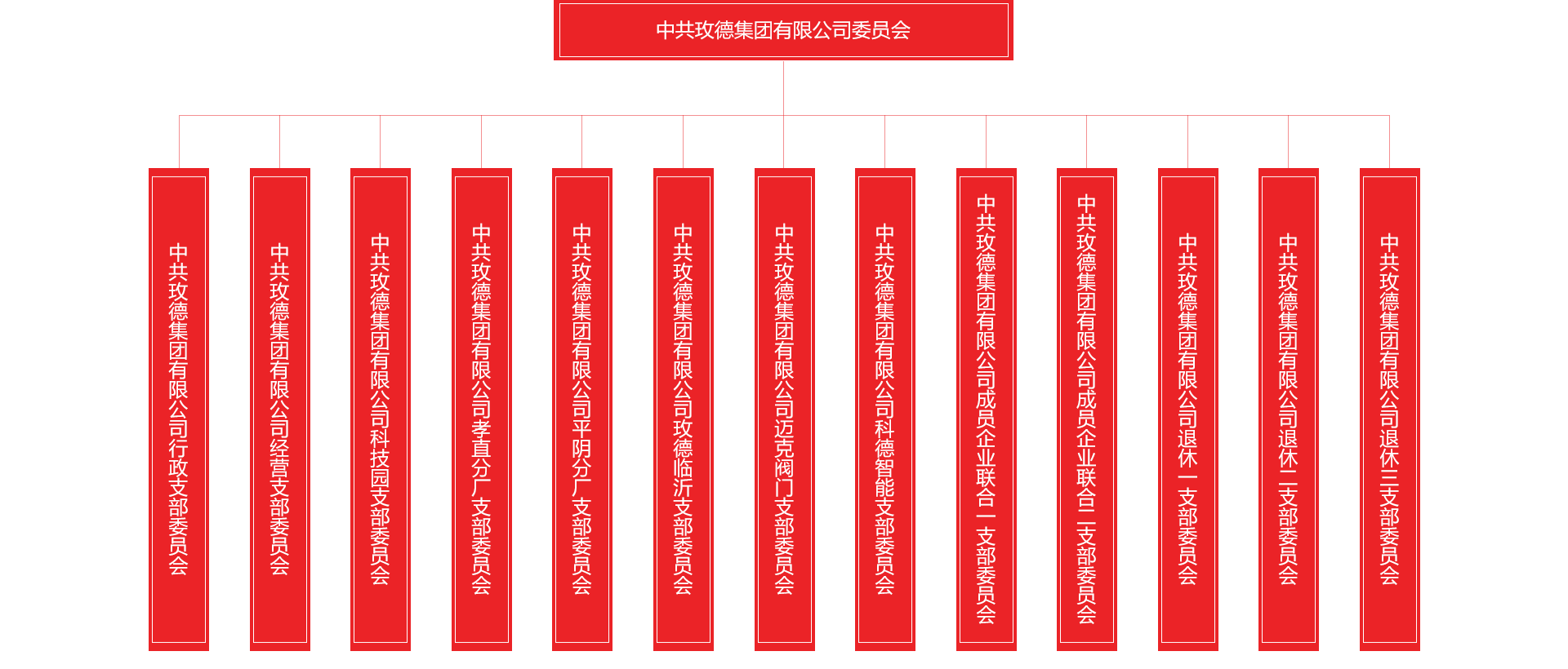 1.中共玫德集團(tuán)有限公司行政支部委員會    2.中共玫德集團(tuán)有限公司經(jīng)營支部委員會    3.中共玫德集團(tuán)有限公司科技園支部委員會    4.中共玫德集團(tuán)有限公司孝直分廠支部委員會    5.中共玫德集團(tuán)有限公司平陰分廠支部委員會    6.中共玫德集團(tuán)有限公司玫德臨沂支部委員會    7.中共玫德集團(tuán)有限公司邁克閥門支部委員會    8.中共玫德集團(tuán)有限公司科德智能支部委員會    9.中共玫德集團(tuán)有限公司成員企業(yè)聯(lián)合一支部委員會    10.中共玫德集團(tuán)有限公司成員企業(yè)聯(lián)合二支部委員會    11.中共玫德集團(tuán)有限公司退休一支部委員會    12.中共玫德集團(tuán)有限公司退休二支部委員會    13.中共玫德集團(tuán)有限公司退休三支部委員會