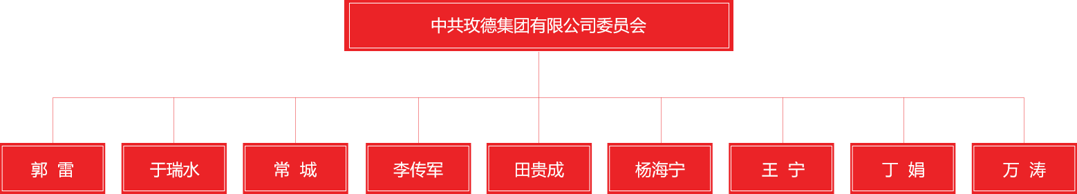 郭雷、于瑞水、常城、李傳軍、田貴成、楊海寧、王寧、丁娟、萬濤九位同志為中共玫德集團(tuán)有限公司委員會委員。郭雷同志任黨委書記,于瑞水同志任黨委副書記。