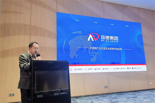 水務(wù)智能研發(fā)部總監(jiān)董天暉參加9+2水司舉辦的供水分論壇,就《不銹鋼產(chǎn)品在直飲水系統(tǒng)中的應(yīng)用》為題講述了玫德集團(tuán)的水務(wù)領(lǐng)域產(chǎn)品涵蓋從源頭(水源接入)到龍頭(飲水入戶),提供從清潔原水到污水處理的一站式解決方案。