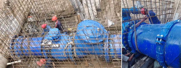 在施工過程中,玫德的工程師團(tuán)隊(duì)深入施工現(xiàn)場(chǎng),與施工單位緊密合作,嚴(yán)格把關(guān)安裝規(guī)范,確保每一個(gè)接口的關(guān)鍵參數(shù)符合規(guī)范。最終項(xiàng)目順利通水,這標(biāo)志著大口徑鋼管溝槽連接方案在閥門井場(chǎng)景中成功應(yīng)用!